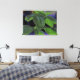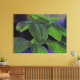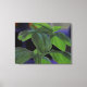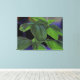 Casi se puede oler el maravilloso perfume de la albahaca que crece en el jardín cuando se ve la foto en esta imagen de tela envuelta. La fotografía original de MaeFlowers es un cierre de la hierba, mostrando las hojas verdes curvadas a medida que crecen dos por dos hasta la parte superior de la planta. La luz brilla a través de algunas hojas de albahaca, haciéndolas más claras de color verde. Detrás de las hojas, el fondo es oscuro, azul negro, con el azul púrpura emergiendo en las esquinas.