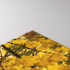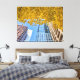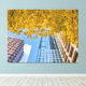 Un disparo en ángulo bajo captura una vibrante escena otoñal en una ciudad. El primer plano está dominado por un baldaquín de hojas amarillas brillantes que enmarcan las vistas de los edificios imponentes. Los edificios, con sus contrastantes texturas de vidrio, ladrillo y hormigón, alcanzan un cielo azul claro. La luz del sol se filtra a través de las hojas, lo que arroja un cálido resplandor en la escena.