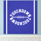 This sporty design features white mirrored bold TOUCHDOWN white text in the shape of a football centered against deep blue background with white vertical end zone edge stripes. The colors in this design can be personalized.