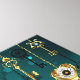 El oro, las llaves antiguas con engranajes y diales cuelgan de las cadenas de oro sobre un fondo verde luminoso.