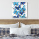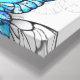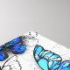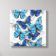 Composición vertical de mariposas morfo realistas, azules y blancas sobre fondo texturado gris. Mariposa morfo azul.