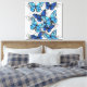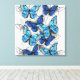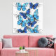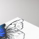 Composición vertical de mariposas morfo realistas, azules y blancas sobre fondo texturado gris. Mariposa morfo azul.