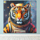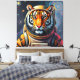 Siberian Tiger dressed as an astronaut stare thoughtfully into space, surrounded by planets and clouds. Vivid blue and orange colors dominate the scene, contributing to a surreal outer space setting.