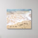 Corazones de playa en arena y oleaje espumoso del océano con nombres personales y fecha de boda.