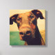 Una divertida foto de un curioso e inquisitivo perro doberman, con una nariz marrón grande, ojos marrones suaves y orejas disquetas naturales. La foto apareció para darle una vieja calidad nostálgica.