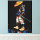 Explosive palette knife oil painting of a futuristic cyber ninja in orange-blue armor and wide conical hat, standing with katana drawn. Thick vibrant impasto strokes in fiery orange, deep blue-black, and glowing neon accents create intense cyberpunk energy and dystopian warrior vibe. Perfect bold modern wall art for gaming rooms, tech spaces, cyberpunk decor, or anyone seeking edgy, textured futuristic samurai/ninja portraits. High-quality print captures rich brushwork and powerful atmosphere.