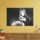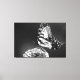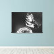 Fotografía en blanco y negro de una mariposa monarca colgada en una flor.