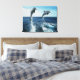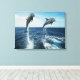 Una pintura de un par de delfines saltando del agua del océano en sincronía.