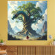 Inmitten eines mystischen Tals erhebt sich ein uralter Baum, verwoben mit dem Körper eines riesigen Drachen. Seine Äste tragen sattes Grün, während der Drache über das Land wacht. Eine einsame Gestalt nähert sich ehrfürchtig – auf der Suche nach Wissen oder Mut?
