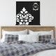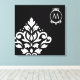Diseño despegado (inferior izquierda) con detalles en blanco sobre un fondo negro en un estilo moderno de diseño con un círculo ornamentado arriba a la derecha con inicial a personalizar.
