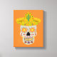 Esta impresionante impresión de lienzo presenta una imagen de diseño gráfico de un cráneo inspirado en el Día de los Muertos de México. El cráneo es de color gris pálido y lleva un sombrero amarillo. Tiene dientes de oro y girasoles mexicanos, también llamados Tithonias< en lugar de ojos. El sombrero tiene un cactus encima y está cubierto por motivos de remolinos de bonito y pimientos de chile rojos y verdes. El cráneo está cubierto de flores de color bonito de diferentes tipos.