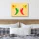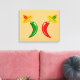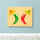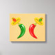Esta impresionante estampa de lienzo incluye un par de ajíes, un chile rojo y un chile verde. Ambos tienen ojos negros y bocas rosas. Cada chile lleva un gorra con sombrero que tiene un cráneo de color opuesto al ají en celebración del Día de los Muertos en México, Día de los Muertos. El sombrero también contiene tres flores con pétalos rojos y verdes alternados que representan la bandera de México.