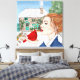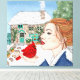 Arte dibujado a mano. La primera nieve. Una dama sostiene a un cardenal en un día de invierno nevado frente a una casa de campo inglesa.