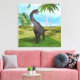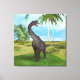 Representación digital 3D de un dinosaurio Brachiosauro sobre el fondo del cielo azul y palmeras verdes