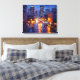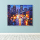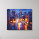 A canvas representation in the impressionist pictorial style of a district street with civilization and traffic at night.