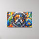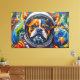 This vibrant artwork presents a captivating close-up of a dog's face, framed within the clear visor of an astronaut's helmet. Rendered with bold, textured strokes in a dynamic palette of oranges, blues, and reds, the canine's expressive gaze meets the viewer. The background unfolds into a stylized cosmic expanse, featuring distant planets and scattered nebulae-like formations, all rendered with a tactile, almost impasto effect. The intricate detailing of the fur and helmet contrasts with the energetic, abstract elements of the surrounding space, creating a striking visual narrative.