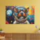 This vibrant artwork presents a captivating close-up of a dog's face, framed within the clear visor of an astronaut's helmet. Rendered with bold, textured strokes in a dynamic palette of oranges, blues, and reds, the canine's expressive gaze meets the viewer. The background unfolds into a stylized cosmic expanse, featuring distant planets and scattered nebulae-like formations, all rendered with a tactile, almost impasto effect. The intricate detailing of the fur and helmet contrasts with the energetic, abstract elements of the surrounding space, creating a striking visual narrative.