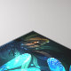 Dos libélulas transparentes, luminosas, turquesas, dibujadas de forma artística sobre el fondo nocturno con algas lacustres luminosas y luciérnagas. Flauta de dragón resplandeciente.