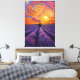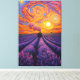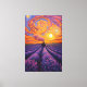 Add a touch of charm to your space with this stunning post-impressionist-style painting. A classic steam train travels through endless vibrant rows of blooming purple lavender fields. At the top, the sky comes to life with dense brush strokes swirling in brilliant shades of orange, pink and yellow, capturing the picturesque beauty of a vibrant sunset.