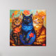 Die Katzen sind von blühenden Blumen umgeben – orange und rosa Blüten, die die Wärme ihrer Fellfarben widerspiegeln und dem Bild eine verspielte Note verleihen. Der Hintergrund besteht aus einem sanften Farbverlauf aus Blau, Grün und Gelb, gemalt mit ausdrucksstarken Pinselstrichen, die eine träumerische Atmosphäre schaffen. Das Licht ist warm und ausgewogen und verleiht den Katzen und Blumen einen sanften Glanz.