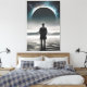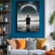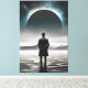 Un hombre solitario contempla un eclipse solar colosal, inmerso en un paisaje costero melancólico. La imagen evoca reflexiones sobre la inmensidad del universo y la insignificancia humana.