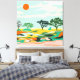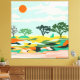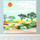 "Ecos del Sahara" captura la serena belleza de un paisaje desértico con una mezcla abstracta de cálidos tonos tierra y vibrantes tonos. Los árboles minimalistas y el brillante sol naranja evocan un ambiente tranquilo y atemporal.