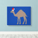 Esta impresionante huella de lienzo muestra una imagen de arte digital de un lindo camello Dromedary de color marrón con hermosas pestañas largas y una única joroba en su espalda. El camello está vestido para celebrar a los Navidades con un sombrero de Santa Claus rojo y blanco en la cabeza. El camello aparece en la Biblia y es un símbolo tradicional de Navidades.