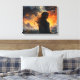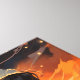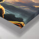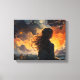 Un joven chica observa una puesta de sol naranja brillante encendiendo un cielo estrellado en llamas. Las nubes se extienden por el horizonte sobre una fantástica ciudad con puentes, torres y ventanas iluminadas. La chica se sienta sobre una colina rocosa con su espalda al espectador, su pelo castaño soplando en el viento. El movimiento en esta imagen es atractivo y una persona no puede evitar imaginar su historia.