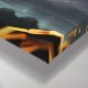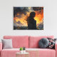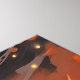 Un joven chica observa una puesta de sol naranja brillante encendiendo un cielo estrellado en llamas. Las nubes se extienden por el horizonte sobre una fantástica ciudad con puentes, torres y ventanas iluminadas. La chica se sienta sobre una colina rocosa con su espalda al espectador, su pelo castaño soplando en el viento. El movimiento en esta imagen es atractivo y una persona no puede evitar imaginar su historia.