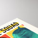 Colorida cuadrícula de estilo retro con los miembros del Escuadrón del Suicidio: Harley Quinn, Bloodsport, King Shark, Polka-Dot Man, Ratcatcher 2, Javelin, Peacemaker, The Thinker y Colonel Rick Flag.
