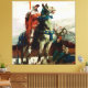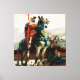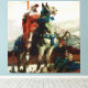 Un caballero armado montado sobre un caballo se para al lado de un río, sosteniendo una lanza con expresión reflexiva. En las cercanías, dos individuos se sientan en el suelo, mirando al caballero con expresiones de preocupación o miedo. Este cuadro se llama "The Coming Lancaster" por Howard Pyle.