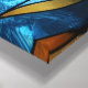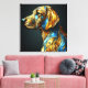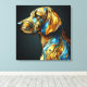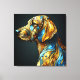 Un retrato que captura la cabeza de un perro en una pose elegante contra un telón de fondo oscuro. Esta obra de arte abstracta de cristal teñido presenta una paleta de tonos azules, turquesa, amarillos, naranjas y dorados. La textura artística y los colores crean un retrato vibrante y elegante de nuestro querido amigo de cuatro patas.