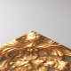 Luxurious still life of white orchids with peach centers, set in a gilded ornate frame. Delicate crystal droplets and a golden trunk evoke opulence, beauty, and refined elegance.