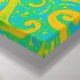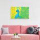 Este elegante arte de lona de pavo real alegrará la decoración de tu casa con un pájaro de colores turquesa y azul sobre un fondo amarillo. Imagen generada con IA.