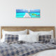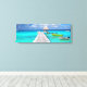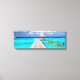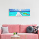 Panorama paisajístico de un espigón de madera con algunos botes coloridos y una cabaña de paja en la laguna azul turquesa de la isla tropical del Pacífico Rangiroa, cerca de Tahití y Bora Bora en la Polinesia Francesa. Gran decoración de verano en la pared.
