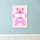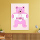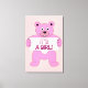Una linda imagen personalizado de un oso rosa sosteniendo un cartel que dice "¡ES UN CHICA!". Este diseño es personalizable y se puede usar para revelar fiestas o anuncios de nacimiento.