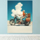 Un ilustracion nostálgico de un viajero solitario que monta una motocicleta vintage a través de un vasto desierto bajo un cielo azul claro. Con una mochila, equipaje y libertad en su espíritu, esta obra de arte captura la lujuria, la aventura y la belleza de horizontes interminables. Perfecto para postales y arte en la pared.