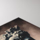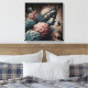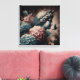 Esta obra de arte cuenta con un busto de mármol clásico de una mujer, de perfil. Su cabello está adornado con flores vibrantes, pasando de moradas suaves a blues silencioso. Encima de ella, un pequeño pájaro se perfila delicadamente entre las flores, realzando el ambiente natural y sereno. El fondo es oscuro y está decorado con texturas, lo que pone de relieve el contraste entre el mármol pálido, las flores vívidas y la forma delicada del ave. La pieza desprende un ambiente romántico y vintage con un sutil sentido de misterio.