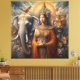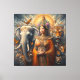 La obra representa una escena poderosa y mística que mezcla elementos de espiritualidad, mitología y naturaleza. La figura central exuda una sensación de serenidad y fortaleza, mientras que los animales circundantes añaden al aura general de poder y mística. Figura central La figura central parece ser una diosa o deidad, adornada con intrincadas joyas doradas y una expresión serena. Su cara medio sombría podría simbolizar la dualidad o la conexión entre diferentes reinos. Su suave interacción con el cachorro tigre sugiere compasión y armonía con la naturaleza. Elementos simbólicos Elefante: A menudo simboliza sabiduría, fuerza y buena fortuna en muchas culturas. Tigre: Representa poder, coraje y protección. Joyas doradas: significa divinidad, riqueza y estatus. Fondo más oscuro: Crea un sentido de misterio y enfatiza la figura central y los animales.