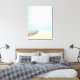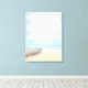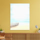 Impresión de lienzo con una hermosa imagen rústica. Tonos sutiles de azul claro, marrón arenoso y blanco suave. Escena de playa con un barco a orillas del mar con una red de pesca colgando de un lado. Una elegante mirada de mal gusto.