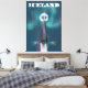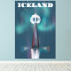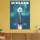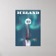 Espada medieval islandesa bajo las luces del norte en afiche de viaje nocturno.