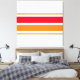 Este diseño deportivo presenta un fondo blanco con atrevidas rayas de carreras horizontales de color rojo intenso y naranja cálido, adosadas con piñones marrones cálidos.