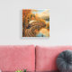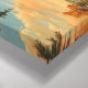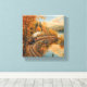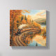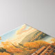 Un vibrante paisaje otoñal. Una larga y sinuosa vía del tren atraviesa un incendio forestal con follaje dorado y naranja. El tren en sí es una locomotora clásica de estilo vintage con vagones múltiples. En primer plano, un pequeño lago refleja los colores del otoño y el paso del tren. El conjunto evoca una sensación de tranquilidad y belleza natural.