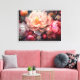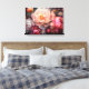 Un vívido acercamiento de peonías y rosas florecientes, mostrando pétalos fluidos suaves en tonos rosa, melocotón y blanco sobre un fondo oscuro. Esta hermosa obra de arte floral trae vida y elegancia a cualquier habitación.