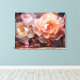 Un vívido acercamiento de peonías y rosas florecientes, mostrando pétalos fluidos suaves en tonos rosa, melocotón y blanco sobre un fondo oscuro. Esta hermosa obra de arte floral trae vida y elegancia a cualquier habitación.