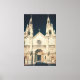 Una fotografía captura la imponente fachada de una gran iglesia. El edificio cuenta con dos torres altas y simétricas con detalles intrincados, cada una coronada por una espina. Una gran cruz se alza sobre la parte central de la iglesia, mientras que una ventana circular de cristal encastrado adorna la parte delantera. La entrada está enmarcada por una serie de arcos y columnas que conducen a una escalera.