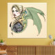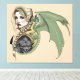 Una rubia coronaba a una guerrera elfo vistiendo armadura con joyas. Un pequeño dragón verde se sienta en el hombro del elfo rubio.