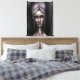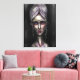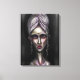 Decoración gótica con fantasía. Una pintura gótica de una mujer fantasmal pálida, con enrojecimiento bajo los ojos y manoseo los labios rojos. Sus ojos están oscuros y hundidos, y parecen tener una historia oscura y trágica. Su cabello está cuidadosamente preparado en un elegante peinado. Tendrils de pelo gris pálido enmarcan su cara, contra un oscuro y ominoso fondo negro.