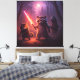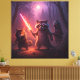 A whimsical fantasy scene set in a dark forest featuring a confident raccoon with a glowing pink and yellow saber, a cautious black cat with a dark sword, and a hooded owl holding a mysterious weapon. Bathed in moonlight with red-eyed intensity and dramatic purples and reds, this playful, cartoonish design blends adventure, sci-fi, and fantasy for imaginative animal art lovers.