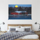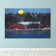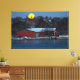 Antiguo boathouse de madera roja con puesta de luna llena en el fondo y helado Mar Báltico en primer plano en Lauttarsaari, huella de tela de Helsinki.